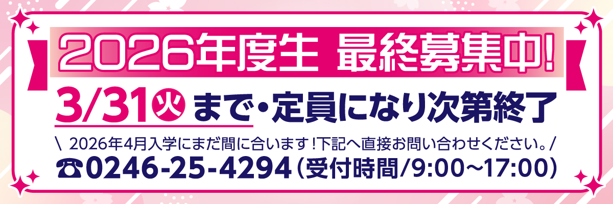 ●令和8年3月、高等学校卒業見込みの方 ●評定平均 理容科2.7以上、美容科3.2以上の方 ●3年間の欠席日数10日以内の方 ●在籍高等学校長の推薦が受けられる方 |