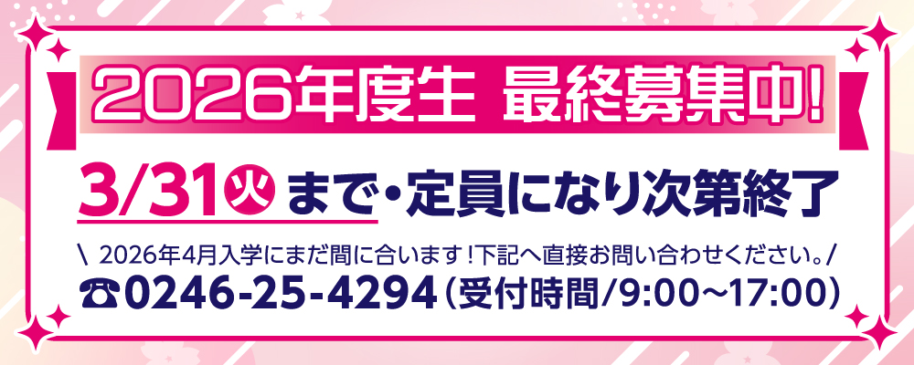 ●高等学校卒業以上(見込みも含む) ●または、これに準ずる学力があると本校が認めた方(中学卒業者及び見込みも含む) |
